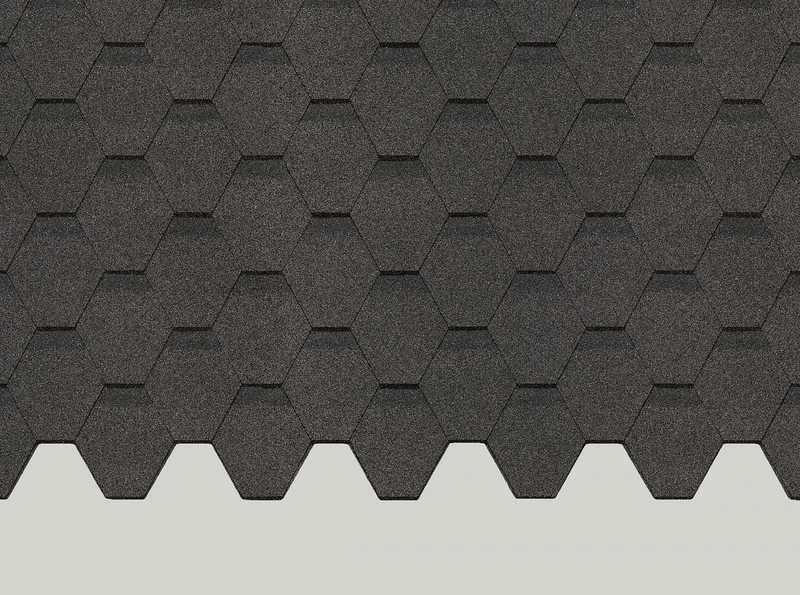 Благородный антрацитовый оттенок хорош в контрастных сочетаниях с сайдингом в светлой цветовой гамме. Гексагональную форму отдельных лепестков подчёркивает приглушенный блеск гранулята (базальт + антрацит), который придает черепице дополнительный визуальный объем.